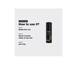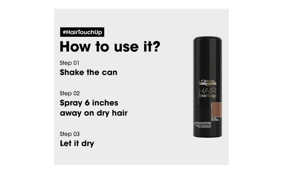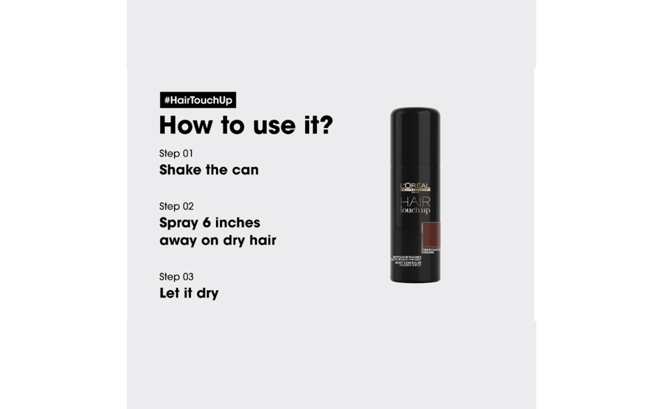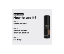 Modo d'uso: applicare su capelli asciutti. Vaporizzare sulla ricrescita e distribuire con le dita per un risultato naturale ed uniforme. Si può utilizzare Hair Touch Up in qualsiasi area si voglia nascondere la ricrescita.